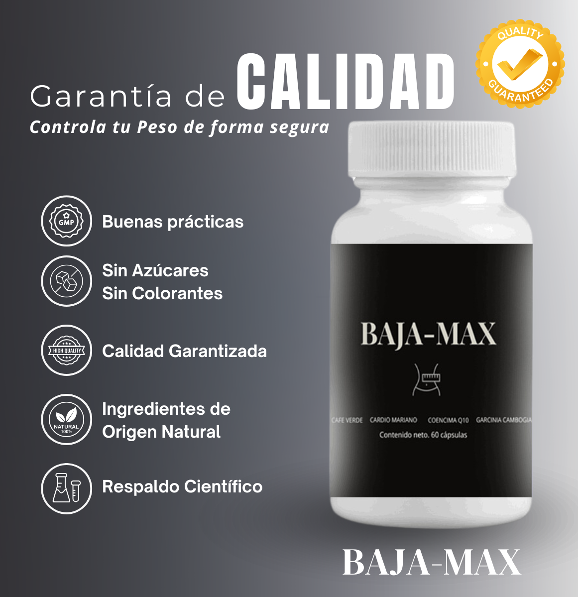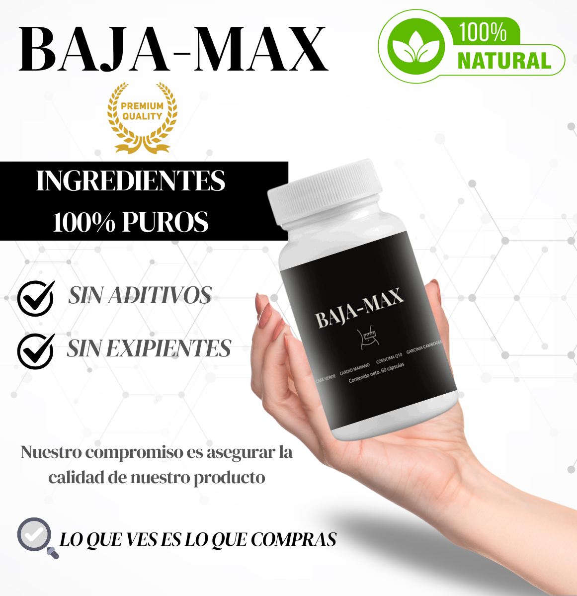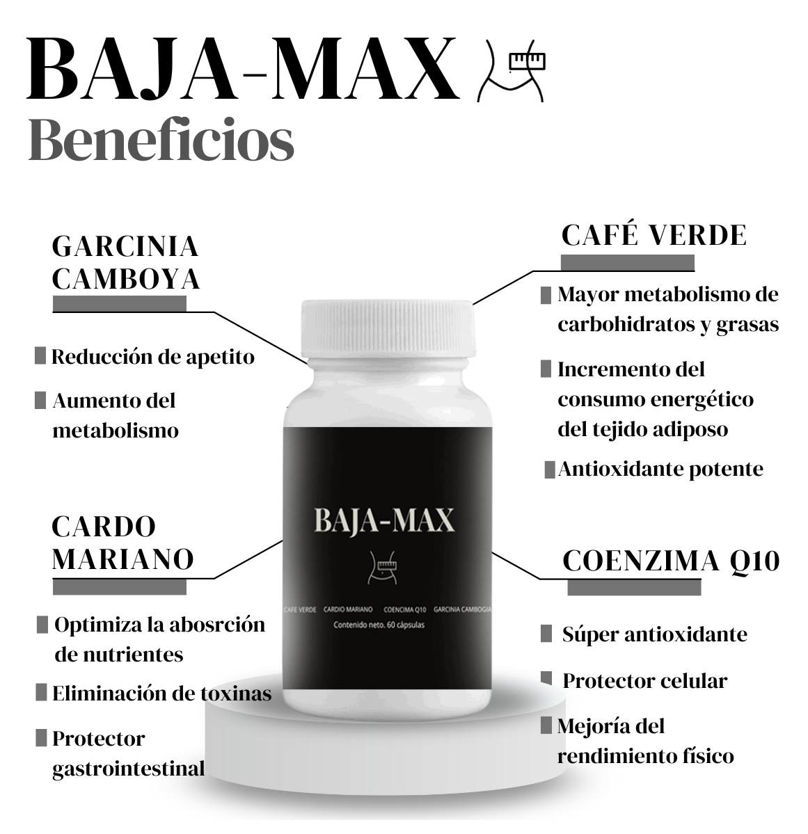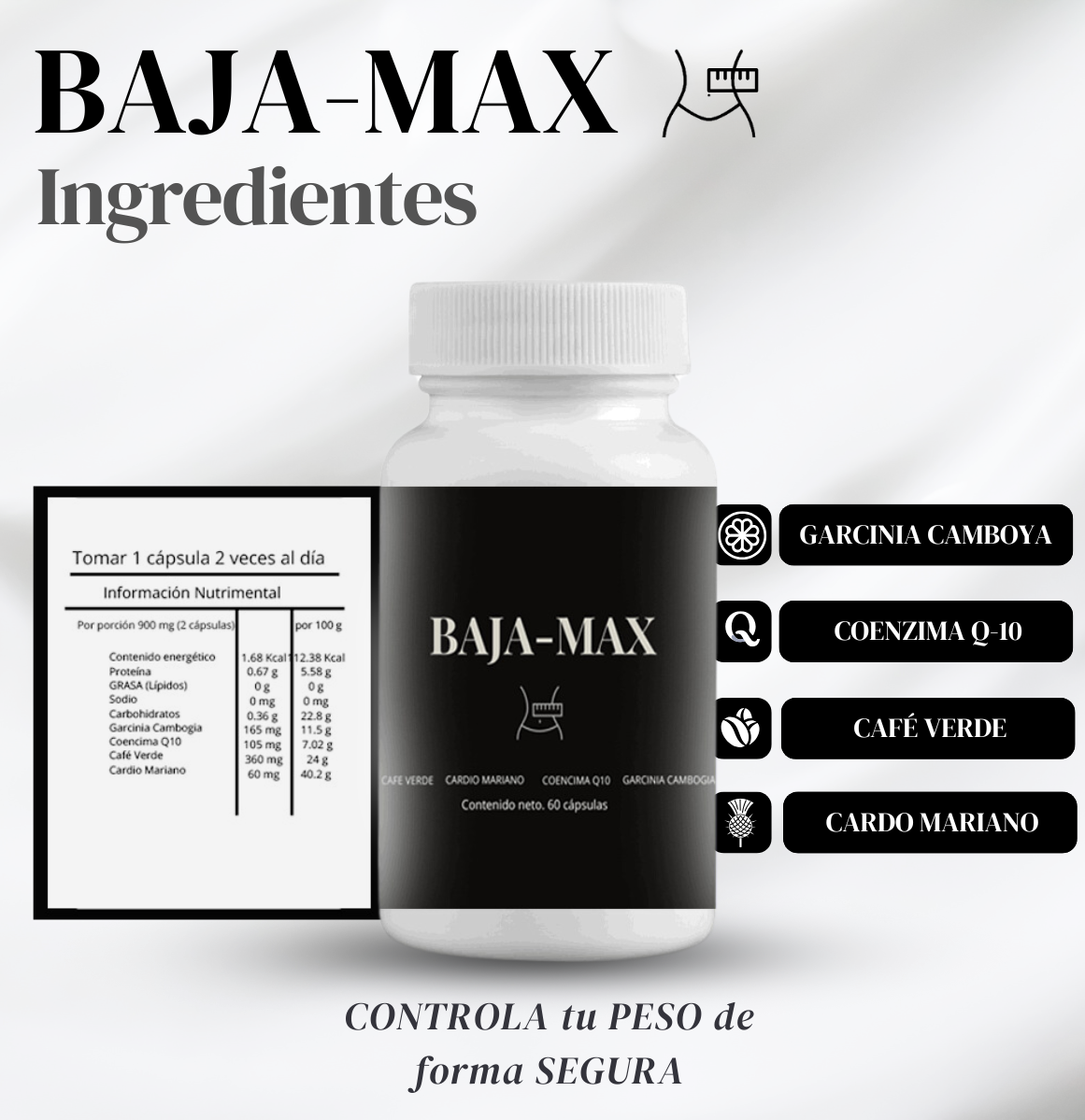 Baja-Max combina ingredientes naturales cuidadosamente seleccionados para apoyar tu proceso de pérdida de peso de manera segura y efectiva.